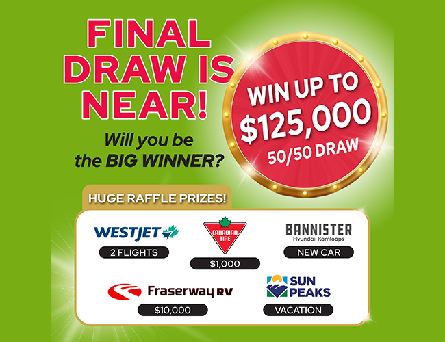 Get ready to win big with our exciting 50/50 Jackpot! Purchase your tickets for a chance to take home half of the total jackpot amount, with the other half supporting the Kamloops Food Bank. Whether you're supporting a great cause or feeling lucky, every ticket you buy brings you closer to winning a substantial cash prize. Don't miss out on your opportunity to win and make a difference!